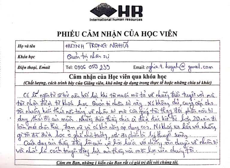 Có lẽ ngôn từ sẽ trở nên bất lực khi tôi muốn mô tả về những điều tuyệt vời mà tôi nhận được từ khóa học này. Nó không chỉ cung cấp cho tôi những kiến thức nền tảng về nhân sự mà còn giúp tôi thay đổi phần nào tư duy, thái độ của mình. Những điều thầy dạy được đúc kết từ hơn 20 năm đi làm một cách thực tế, đam mê và có khả năng áp dụng cao. Nó khác xa hoàn toàn với những gì tôi đã từng học ở ghế nhà trường, nơi đa phần là lý thuyết suông. Cách dạy của thầy đầy lôi cuốn và hài hước với những câu chuyện về nhân sự, và nhất là cách truyền động lực mạnh mẽ vào mỗi học viên chúng tôi.