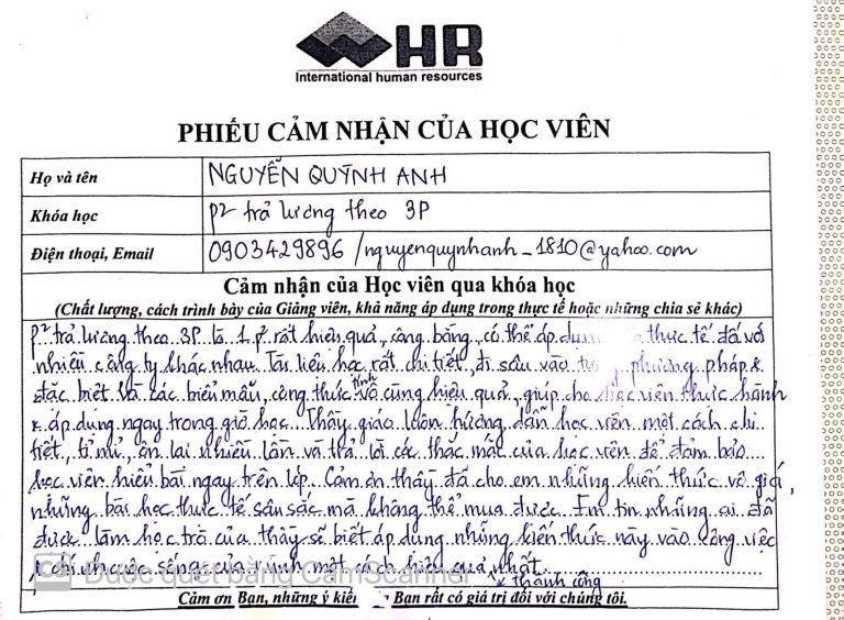 Phươn pháp trả lương theo 3P là một phương pháp rất hiệu quả, công bằng, có thể áp dụng thực tế đối với nhiều công ty khác nhau. Tài liệu học rất chi tiết, đi sâu vào từng phương pháp, đặc biệt là các biểu mẫu, công thức vô cùng hiệu quả, giúp cho học viên thực hành và áp dụng ngay trong giờ học. Thầy giáo luôn hướng dẫn học viên một cách chi tiết, tỉ mỉ, ôn lại nhiều lần và trả lời các thắc mắc của học viên để đảm bảo học viên hiểu bài ngay trên lớp. Cảm ơn thầy đã cho em những kiến thức vô giá và những bài học thực tế sâu sắc mà không thể mua được. Em tin những ai đã được làm học trò của thầy sẽ biết áp dụng những kiến thức này vào công việc, sự nghiệp và cuộc sống của mình một cách hiệu quả nhất.