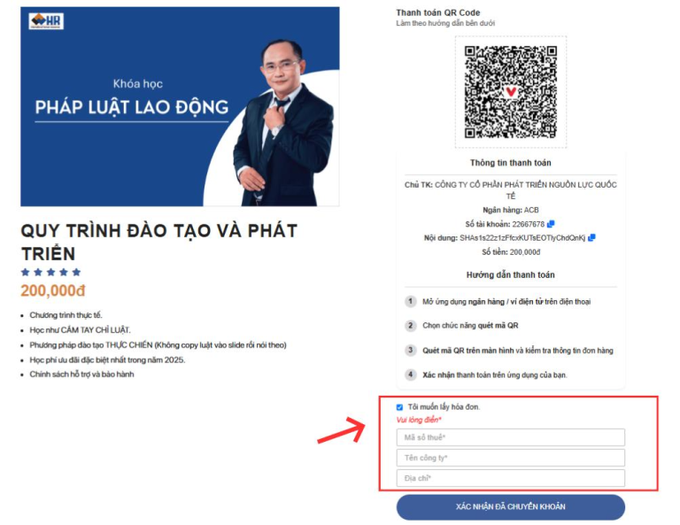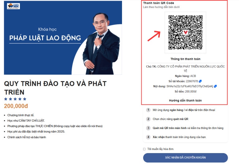 Tại trang thanh toán của khóa học, hệ thống sẽ hiển thị mã QR thanh toán.